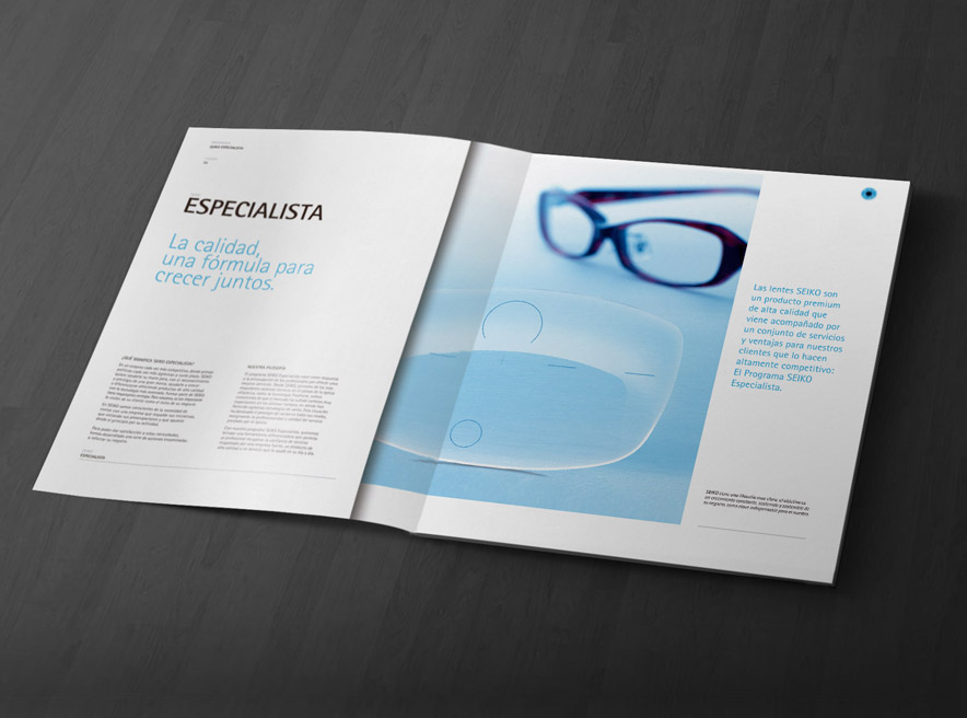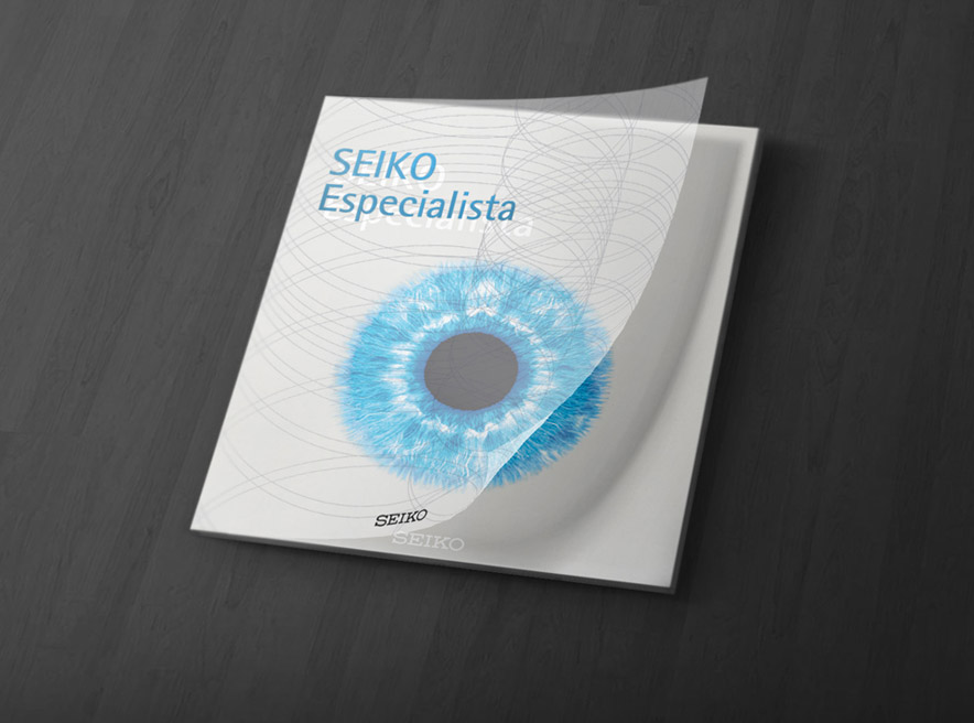Como en sus lentes, la transparencia es una clave importante para sorprender a un público exigente acostumbrado a un entorno visual del más alto nivel. Por esta razón, diseñamos una portada compuesta: una transparencia con un mosaico de lentes que se superponen a la imagen de SEIKO Optical corporativa.